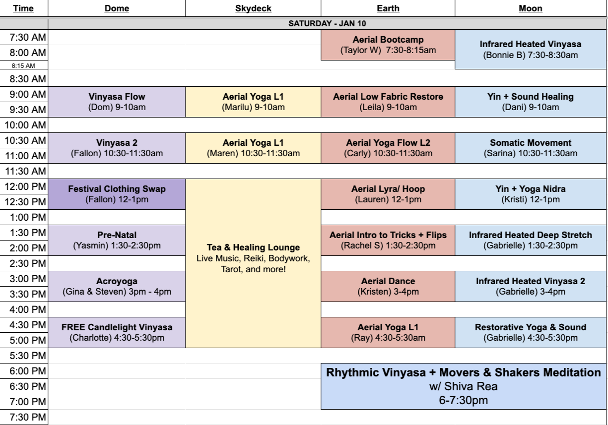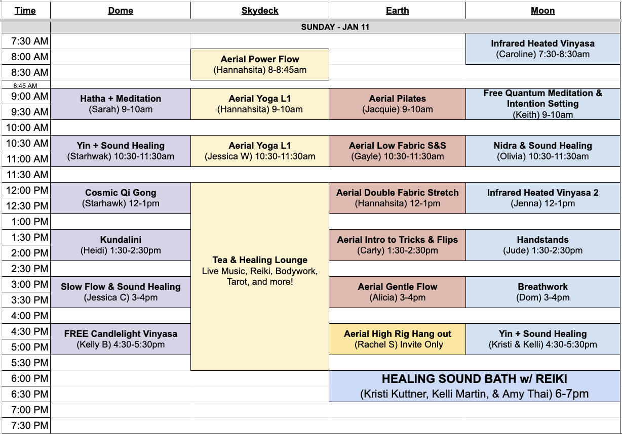 Aerial Dance Flow ● Aerial Flips & Tricks L1/2 ● Aerial Gentle Flow ● Aerial Lyra ● Aerial Pilates ● Aerial Power Flow ● Aerial Yoga L1 ● Vinyasa ● Handstands ● Hatha ● Infrared Heated Deep Stretch ● Hatha ● Infrared Heated Power Vinyasa ● Kundalini ● Low Fabric Aerial Deep Stretch ● Low Fabric Strength & Stretch ● Prenatal Yoga ● Qi-Gong ● Restorative Yoga ● Slow Flow & Sound Healing ● Vinyasa L2 + Meditation & Intention Setting ● Spirit Talk ● Yin + Sound Healing ● Yin + Yoga Nidra ● Yoga Nidra + Sound Healing ● Youth Aerial ● Open Gym ...